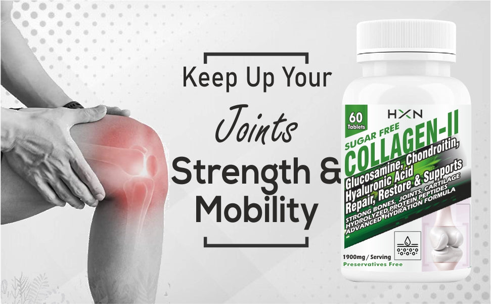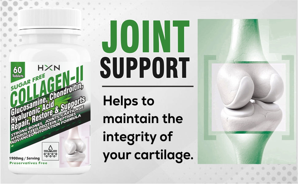 COLLAGEN THAT HELPS YOU STAY ON THE MOVE: Type II collagen supports cartilage its tensile strength and elasticity, thereby enabling it to support the joints..Glucosamine and Chondroitin are the building blocks of joint- cartilage, ligaments, tendons and synovial fluid